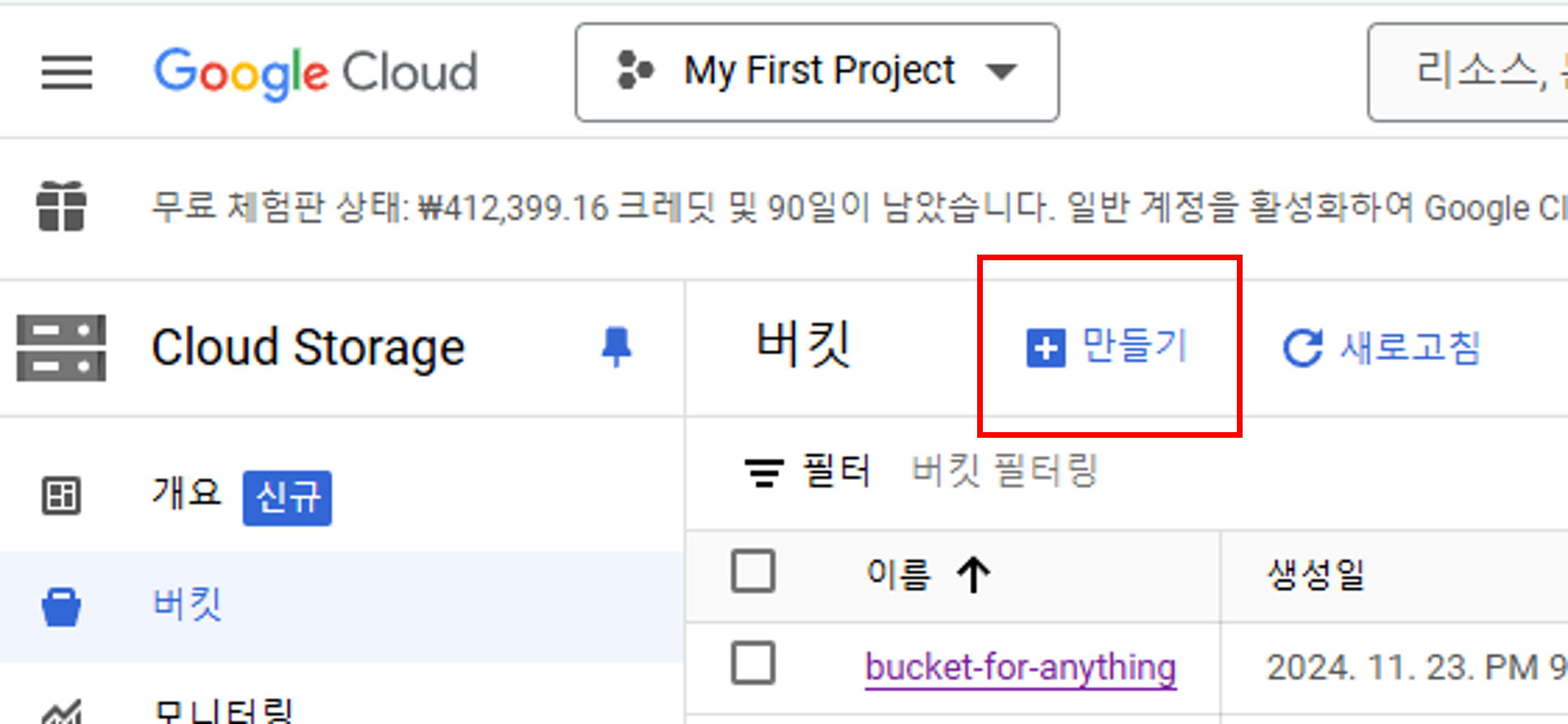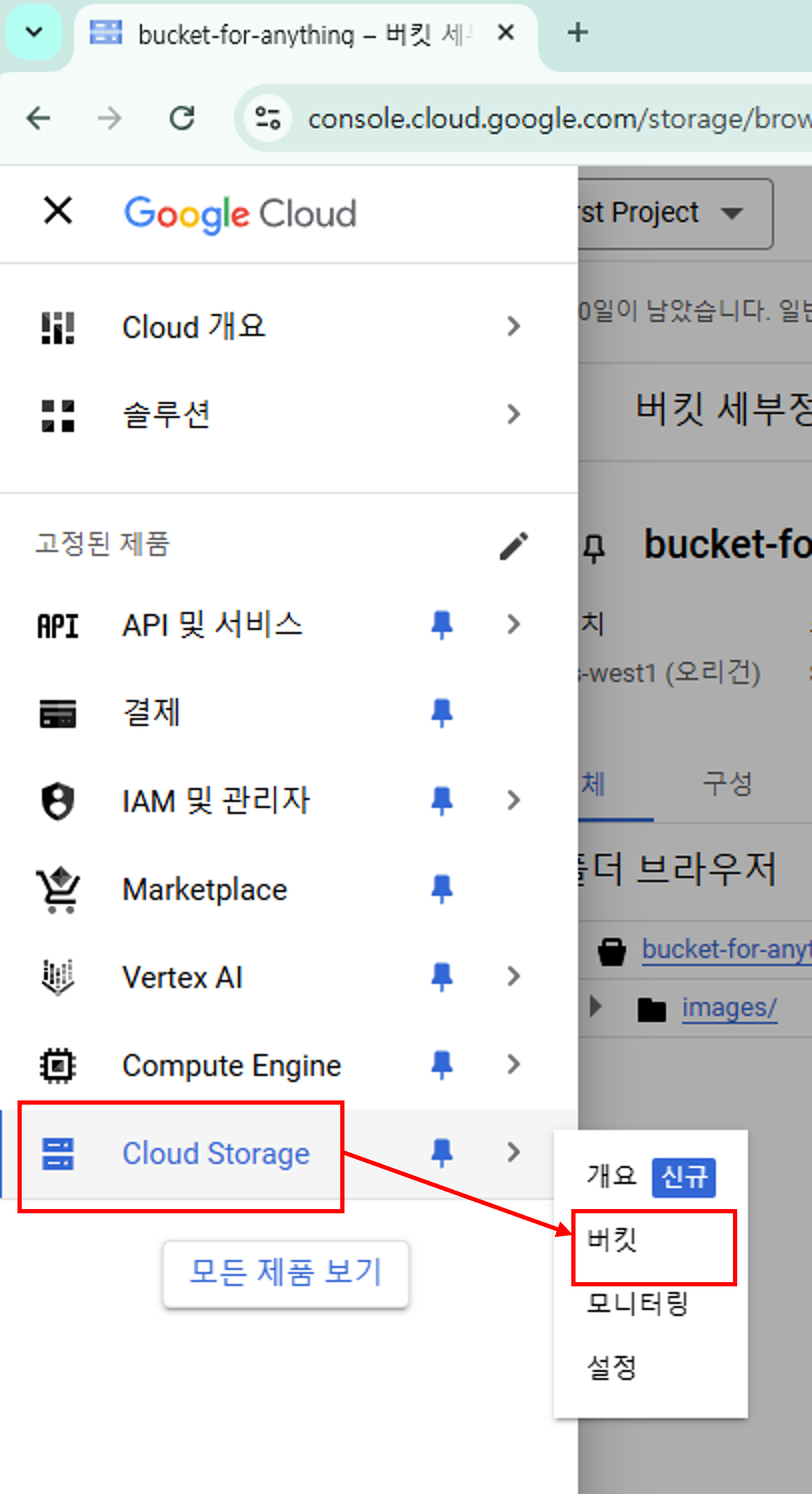 클라우드 스토리지에서 '버킷'을 눌러서 버킷 창을 열어주세요.